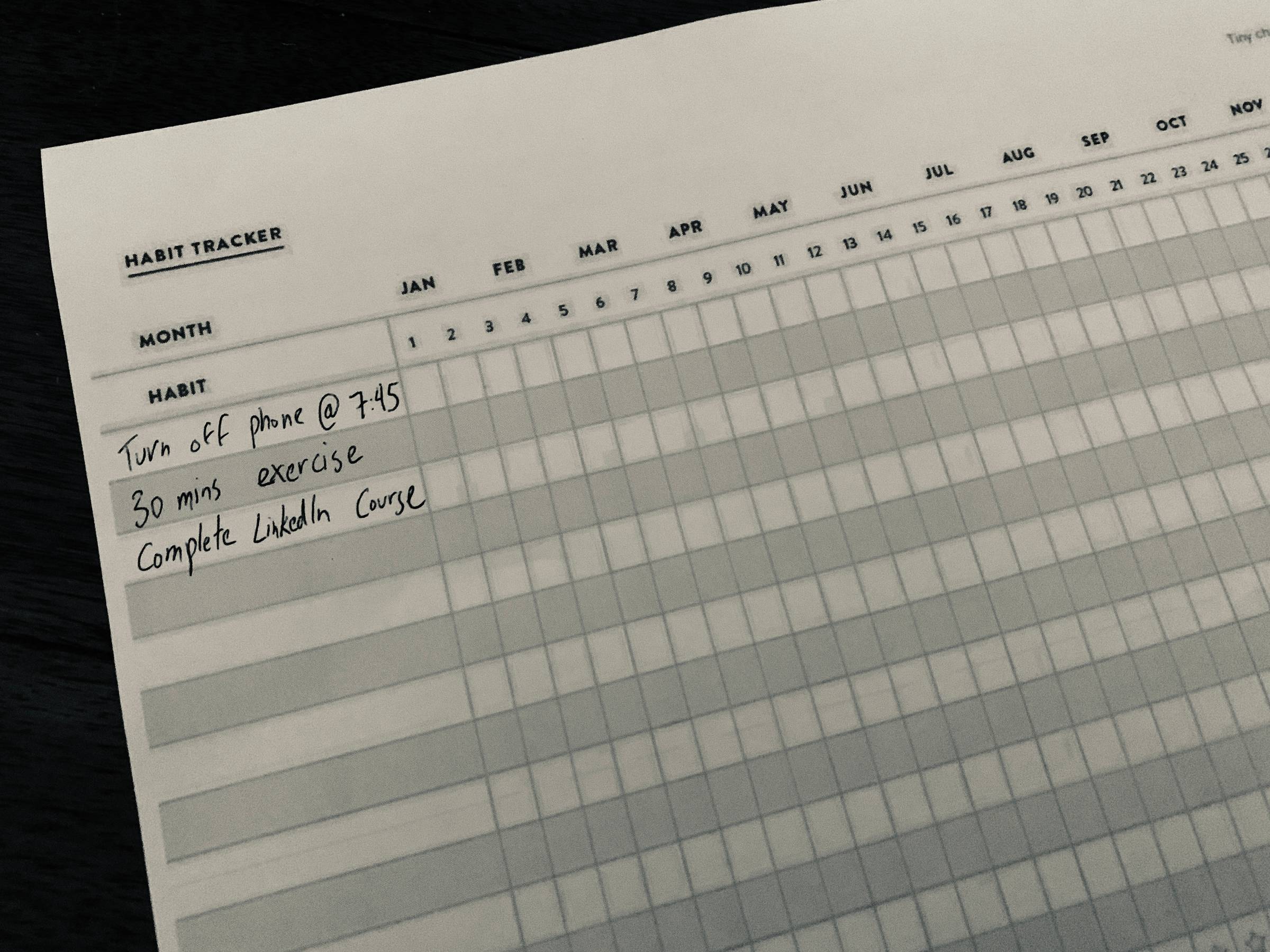 He’s flipped open the Clear Habits Journal and confidently writes in 3 new habits: